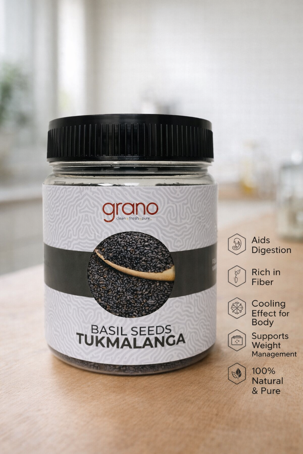 Grano Foods Premium Basil Seeds (Tukh Malanga) – Fresh, Clean & Naturally Cooling | 250g / 500g Jar